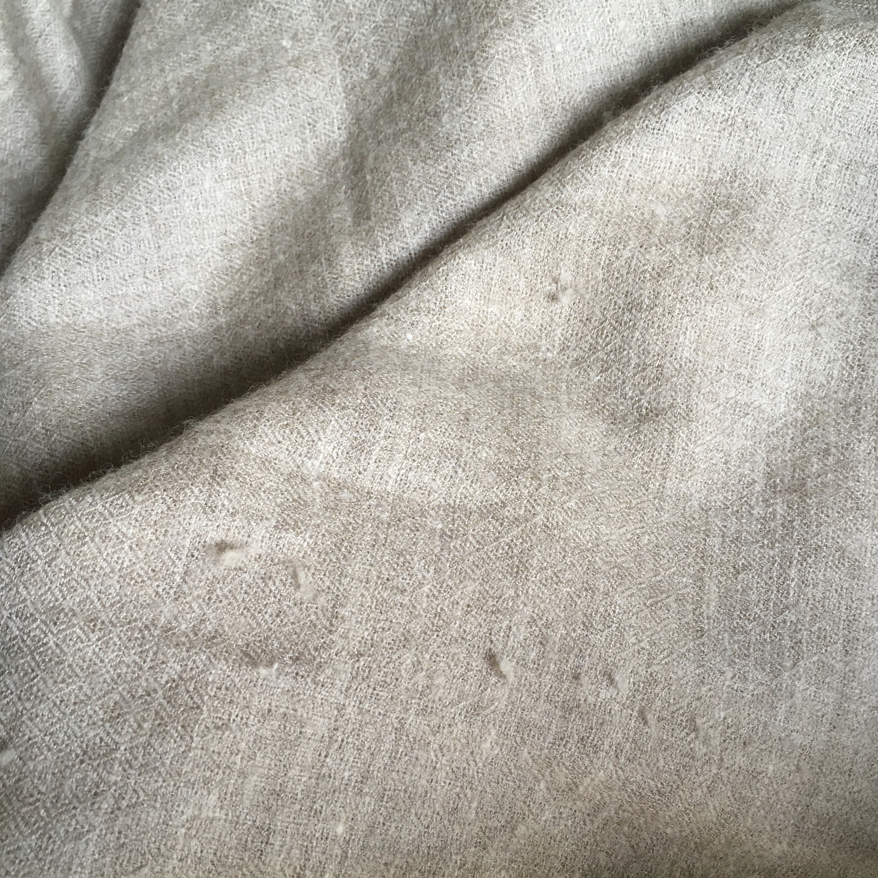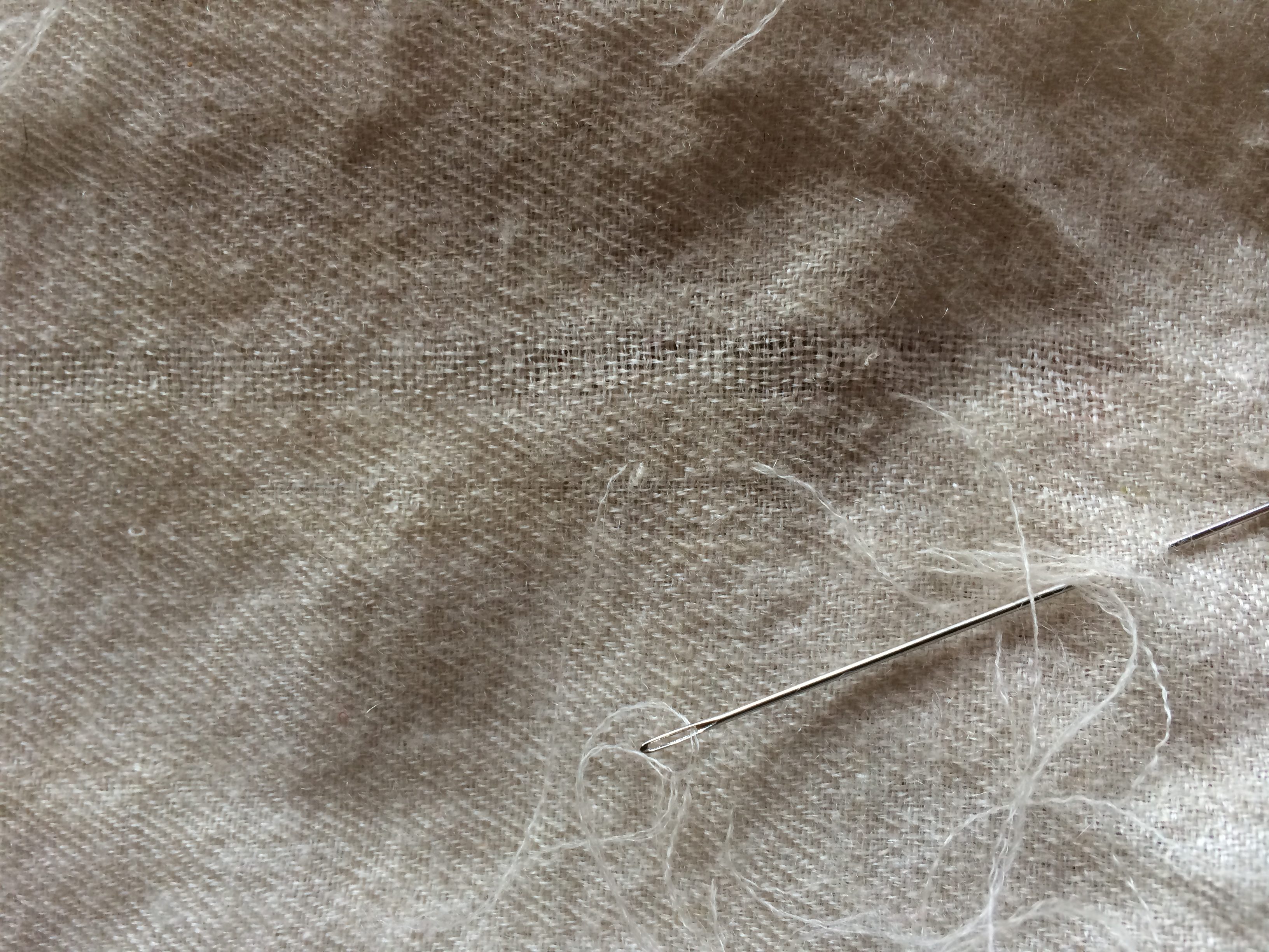 ¡Un desastre! Se ha colado una polilla… No te asustes, como la tela está tejida, el agujero no será tan grande como en un punto. En Cachemira, los Rafugar reparan fácilmente los agujeros con el hilo de los orillos. En Francia, es un oficio que se está perdiendo, el del remailleur
