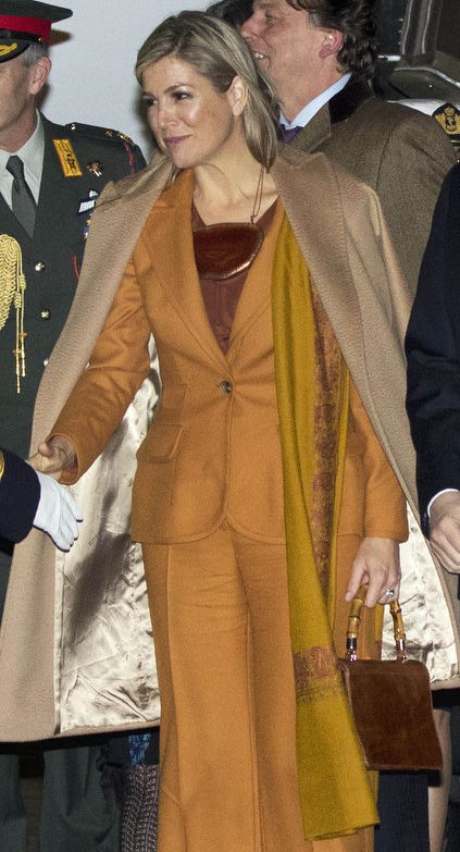 La preferita di Maxima? Un capo iconico: lo scialle di pashmina beige naturale non tinto, che indossa sia drappeggiato che come sciarpa al collo. Le tonalità naturali delle pashmine rimangono emblematiche di questo tessuto eccezionale e sono una scommessa sicura!